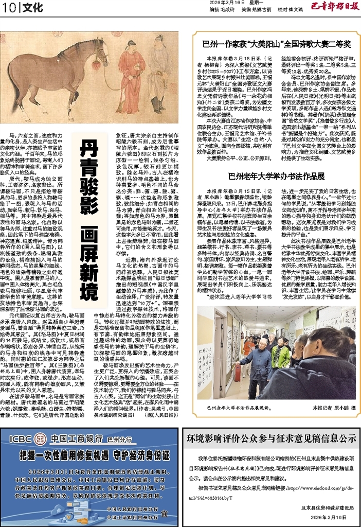 - 巴州老年大学举办书法作品展 本报库尔勒3月15日讯 (记者 原小鹏) 翰墨飘香颂盛世,银龄挥毫展风采。13日,巴州养老服务指导中心(老年大学)举办书法作品展。展览汇集学校书法班师生百余幅作品,以笔墨传情、以书法载道,为师生及