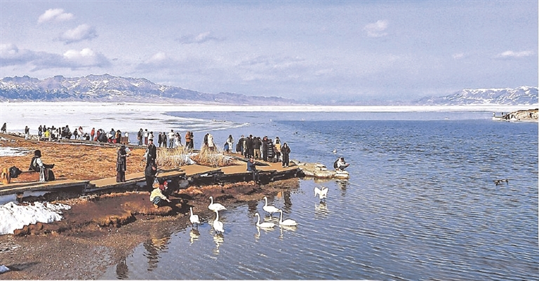 3月15日,游客在赛里木湖观赏天鹅。近年来,赛里木湖景区生态环境越来越好,吸引着天鹅等候鸟来此栖息。
