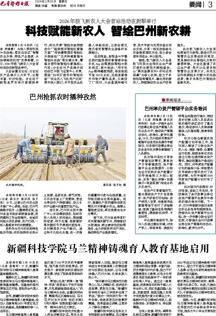 - 科技赋能新农人 智绘巴州新农耕 本报尉犁3月19日讯 (记者 周海霞) 为深入贯彻科技兴农战略,落实自治区“智慧农业升级、特色产业提质、水资源高效利用”发展部署,18日,2026年极飞新农人大会首站活动在尉犁县举行。 大会设