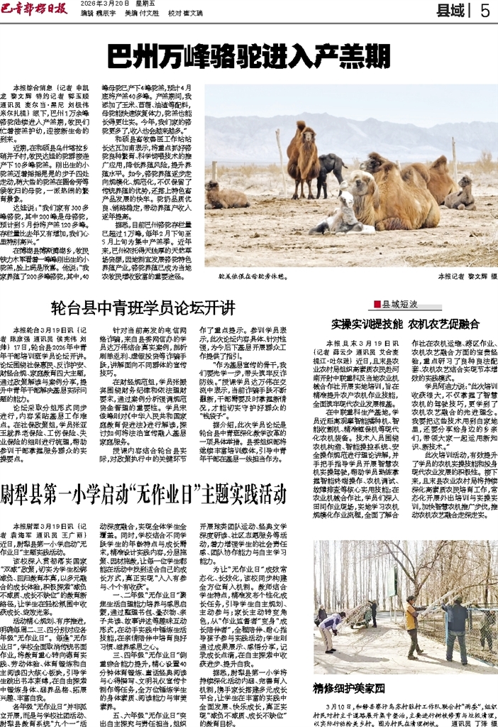 - 轮台县中青班学员论坛开讲 本报轮台3月19日讯 (记者 陈彦强 通讯员 侯宪伟 刘帅) 17日,轮台县2026年中青年干部培训班学员论坛开讲。论坛围绕社保惠民、反诈护安、财经合规、家庭教育四大主题,通过政策解读与案例分享,