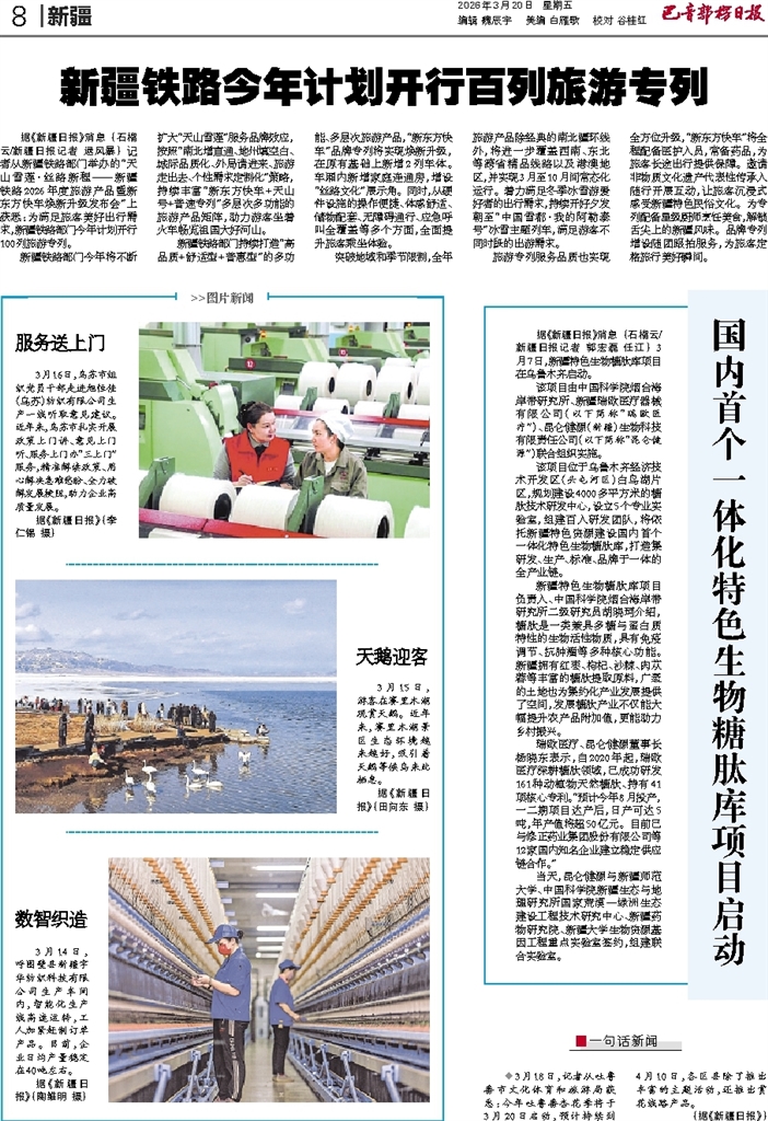 - 新疆铁路今年计划开行百列旅游专列 据《新疆日报》消息 (石榴云/新疆日报记者 逯风暴) 记者从新疆铁路部门举办的“天山雪莲·丝路新程——新疆铁路2026年度旅游产品暨新东方快车焕新升级发布会”上获悉:为满足旅客美好出行需求,新疆铁