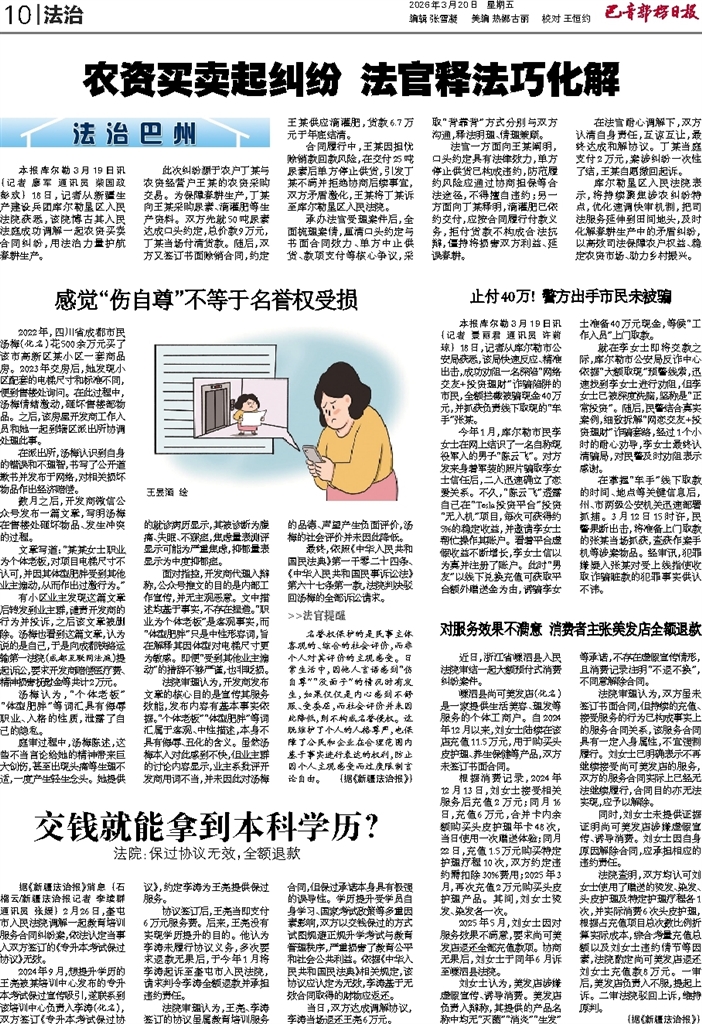 - 农资买卖起纠纷 法官释法巧化解 本报库尔勒3月19日讯 (记者 廖军 通讯员 柴国政 彭欢) 18日,记者从新疆生产建设兵团库尔勒垦区人民法院获悉,该院博古其人民法庭成功调解一起农资买卖合同纠纷,用法治力量护航春耕生产。 此