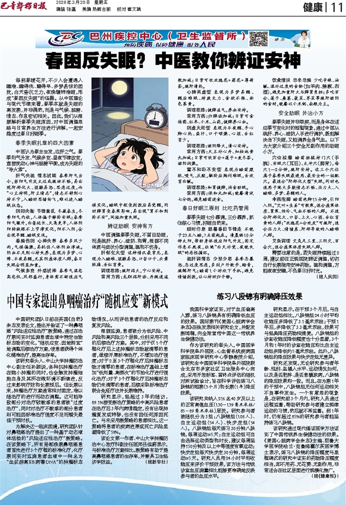 - 中国专家提出鼻咽癌治疗“随机应变”新模式 中国研究团队日前在英国《自然》杂志发表论文,提出并验证了一种鼻咽癌“风险适应性治疗”新策略,通过在治疗期间实时监测患者血液中特定生物标志物的变化,“随机应变、因地制宜”地调整后续治疗方案,使患者获