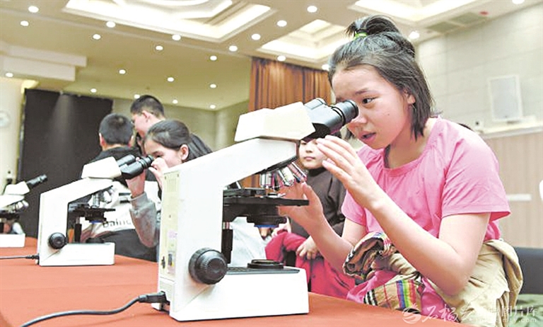 4月2日,在新疆细胞生命科技馆,学生通过显微镜观察动植物细胞。当日下午,该馆开展“科普母亲”春假研学活动,吸引了很多学生前来探秘。
