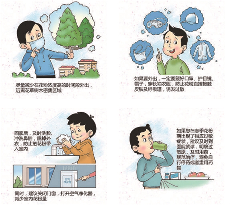 短期常规措施可归纳为“挡”“洗”“药”“避”四字诀。“挡”即戴口罩等物理防范措施,“洗”是常洗眼洗鼻洗手,“药”为合理使用针对性治疗药物,“避”是主动避开在花粉高浓度的时间外出。