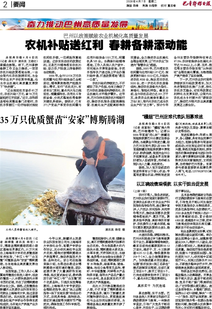 - 以正确政绩观领航 以实干担当促发展 (上接1版) 农时不等人,服务送到家。巴州农业农村局紧盯春耕时节,发挥农业系统9支农业生产科技服务指导组作用,通过集中宣讲、入户走访、田间指导、共同劳作等方式,推动各项惠农政策精准落地到户、惠