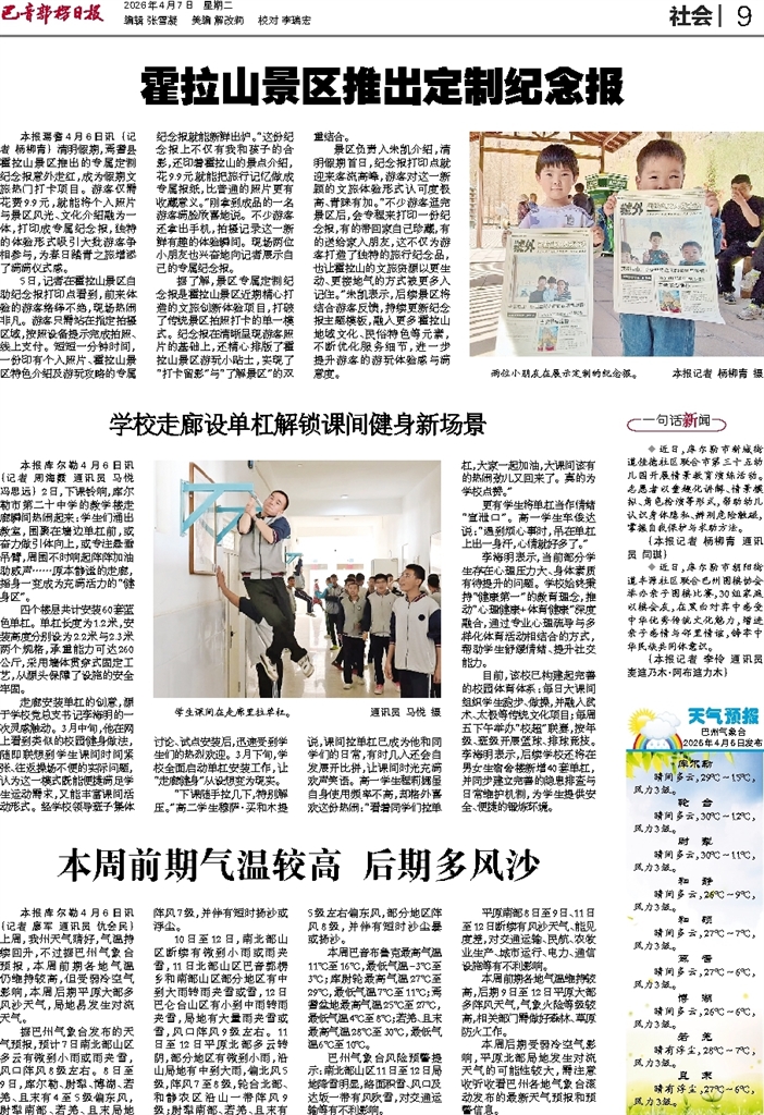 - 霍拉山景区推出定制纪念报 本报焉耆4月6日讯 (记者 杨柳青) 清明假期,焉耆县霍拉山景区推出的专属定制纪念报意外走红,成为假期文旅热门打卡项目。游客仅需花费9.9元,就能将个人照片与景区风光、文化介绍融为一体,打印成专属