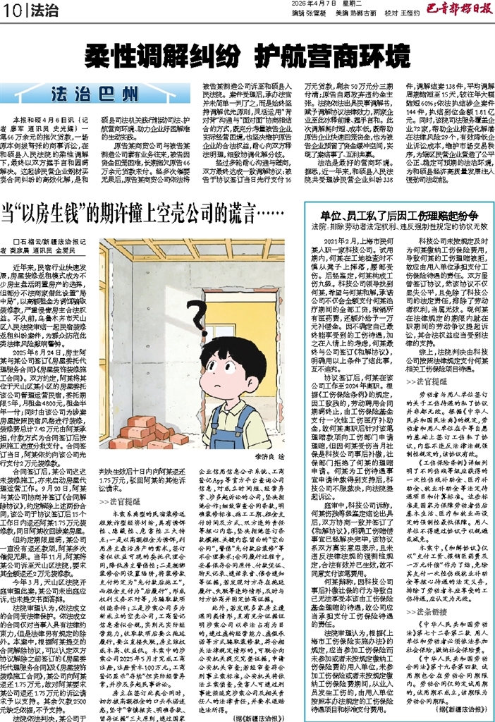- 柔性调解纠纷 护航营商环境 本报和硕4月6日讯 (记者 廖军 通讯员 史光耀) 一笔66万余元的拖欠货款,一场原本剑拔弩张的商事诉讼,在和硕县人民法院的柔性调解下,最终以双方握手言和圆满解决。这起涉民营企业钢材买卖合同纠纷的