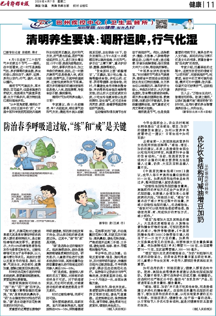 - 清明养生要诀:调肝运脾,行气化湿 □新华社记者 田晓航 帅才 4月5日迎来了二十四节气中的第五个节气——清明。在中医看来,这一时节是调畅气机、养护脾胃的黄金期,养生的核心原则在于:调肝、运脾、养阳以安内;行气、避风、化湿以