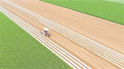 4月9日,在河南省商丘市睢县尚屯镇凡庄村一处农田,农机手驾驶播种机种植花生(无人机照片)。