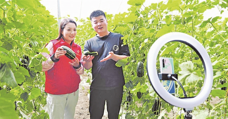 4月7日,在阿瓦提县塔木托格拉克镇吐格贝希村温室大棚里,年轻干部通过直播带货推广销售农产品,助力农民增收。