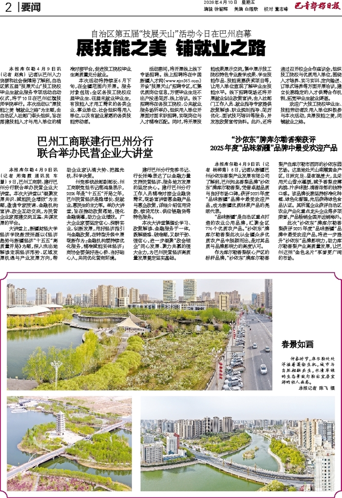 - 春景如画 仲春时节,库尔勒处处洋溢着蓬勃生机,城市与自然相融共生,水清岸绿的生态景致勾勒出宜居宜游的动人画卷。 本报记者 陈飞 摄