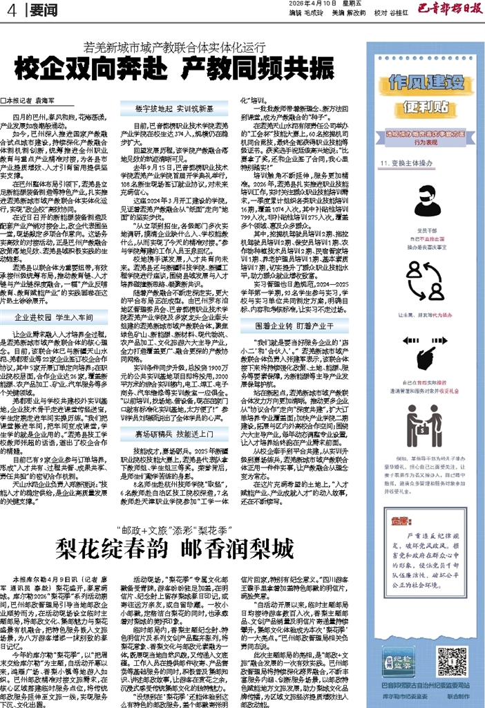 □本报记者 袁海军 四月的巴州,春风和煦,花海荡漾,产业发展如浪潮般涌动。 如今,巴州深入推进国家产教融合试点城市建设,持续深化产教融合体制机制创新,统筹推进全州职业教育与重点产业