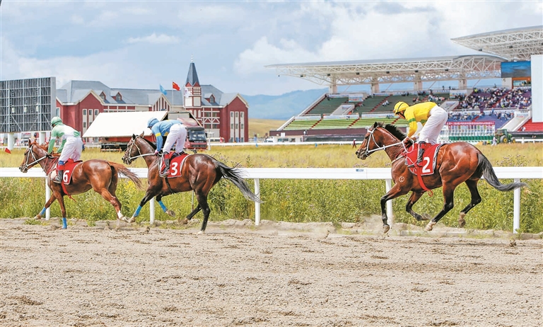 7月9日,云南代表队运动员余星和赛马“特神”(左)、内蒙古代表队运动员阿拉斯和赛马“福安之歌”(中)、新疆代表队运动员阿曼·叶力奴尔和赛马“金枪六九”(右)在比赛中展开激烈角逐。