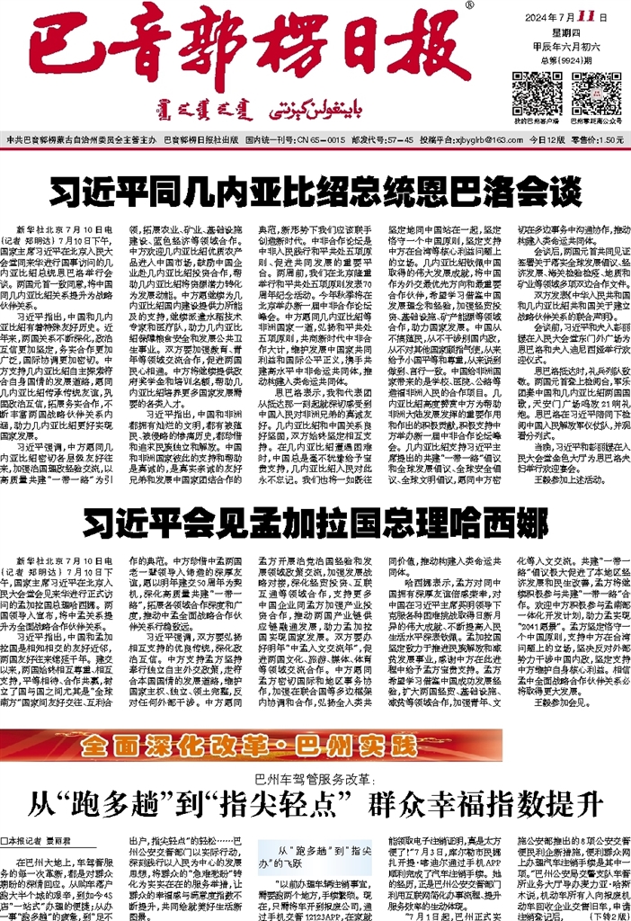 - 习近平会见孟加拉国总理哈西娜 新华社北京7月10日电 (记者 郑明达) 7月10日下午,国家主席习近平在北京人民大会堂会见来华进行正式访问的孟加拉国总理哈西娜。两国领导人宣布,将中孟关系提升为全面战略合作伙伴关系。 习近平