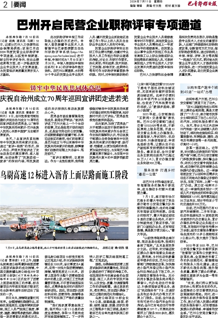 - 巴州开启民营企业职称评审专项通道 本报库尔勒7月10日讯 (记者 赵爽 通讯员 马媛) 10日,记者从巴州人力资源和社会保障局获悉:该局已开启2024年度民营企业职称评审专项通道,从拓宽申报渠道、树立科学评价导向、突出业绩成果等方