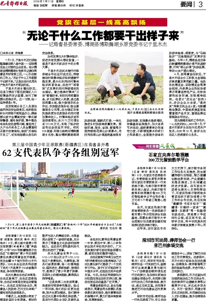 - “无论干什么工作都要干出样子来” □本报记者 周海霞 7月5日,于里木杰正忙碌地整理着在第八届中国——亚欧博览会上对接的企业信息。他从博湖县博斯腾湖乡党委书记调任焉耆县专职常委之后,一心扑在新的工作上。“无论干什么工作