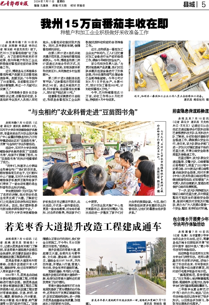 - 我州15万亩番茄丰收在即 本报库尔勒7月10日讯 (记者 刘雨珊 申凯龙 特约记者 郭玉顺 布音克西克) 眼下,巴州15万亩番茄陆续“红了脸庞”。为了迎接即将到来的丰收季,我州种植户和加工企业积极做好番茄采收前的各项准备工