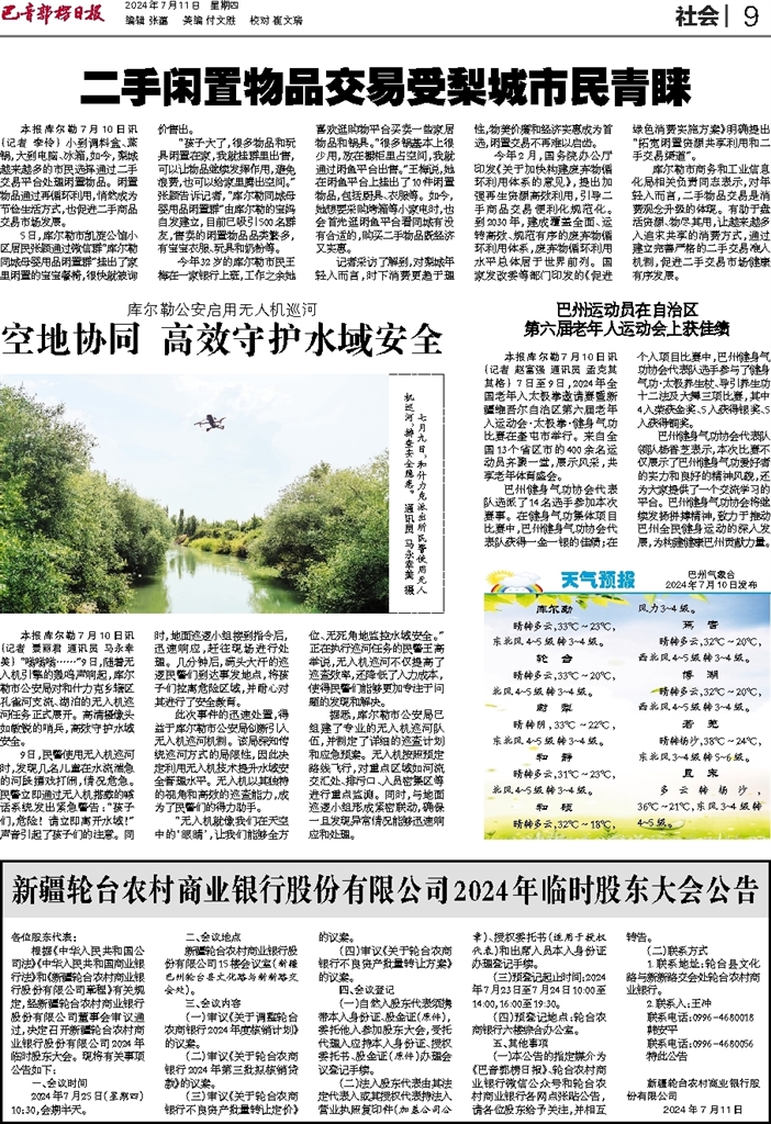 - 空地协同 高效守护水域安全 本报库尔勒7月10日讯 (记者 景丽君 通讯员 马永幸美) “嗡嗡嗡……”9日,随着无人机引擎的轰鸣声响起,库尔勒市公安局对和什力克乡辖区孔雀河支流、湖泊的无人机巡河任务正式展开。高清摄像头如敏锐