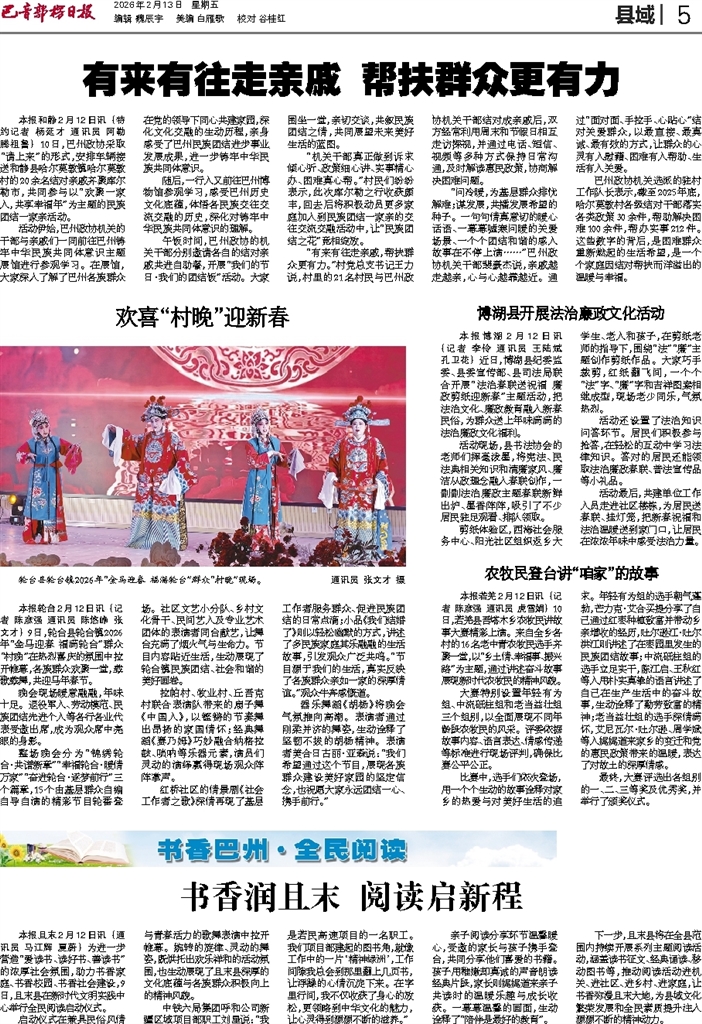 - 欢喜“村晚”迎新春 本报轮台2月12日讯 (记者 陈彦强 通讯员 陈悠峥 张文才) 9日,轮台县轮台镇2026年“金马迎春 福满轮台”群众“村晚”在热烈喜庆的氛围中拉开帷幕,各族群众欢聚一堂,载歌载舞,共迎马年春节。