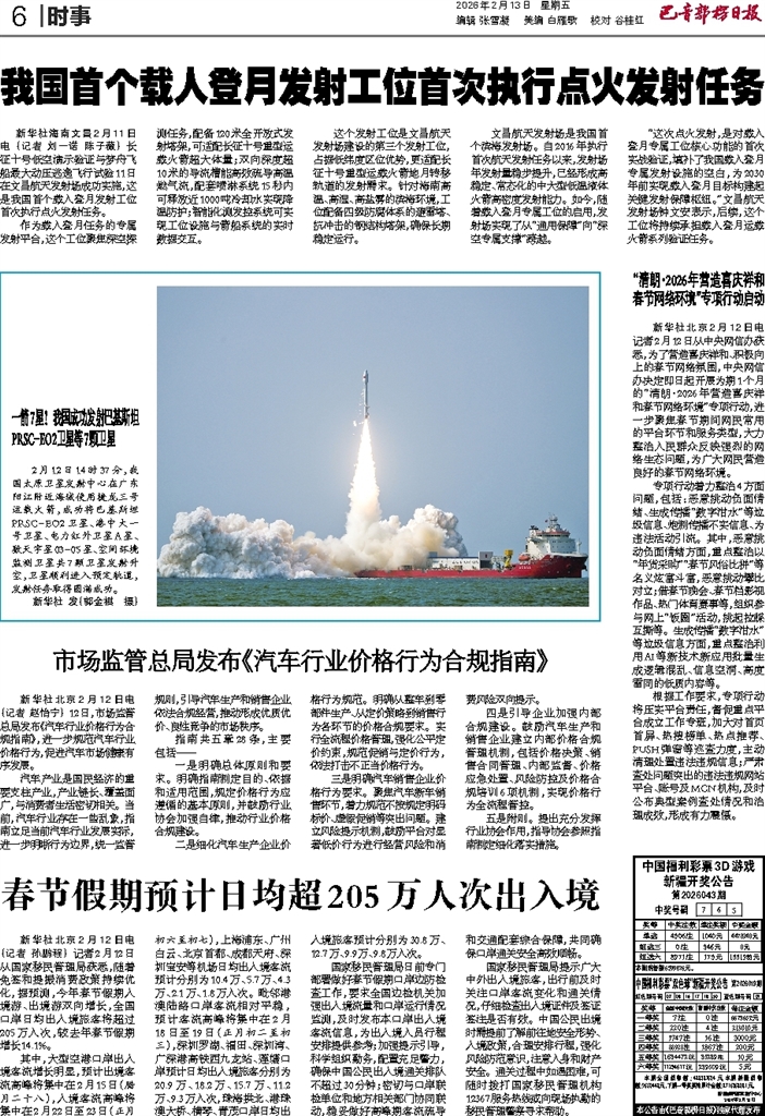 - “清朗·2026年营造喜庆祥和 春节网络环境”专项行动启动 新华社北京2月12日电 记者2月12日从中央网信办获悉,为了营造喜庆祥和、积极向上的春节网络氛围,中央网信办决定即日起开展为期1个月的“清朗·2026年营造喜庆祥和春节网络环境”专项行动,进一步