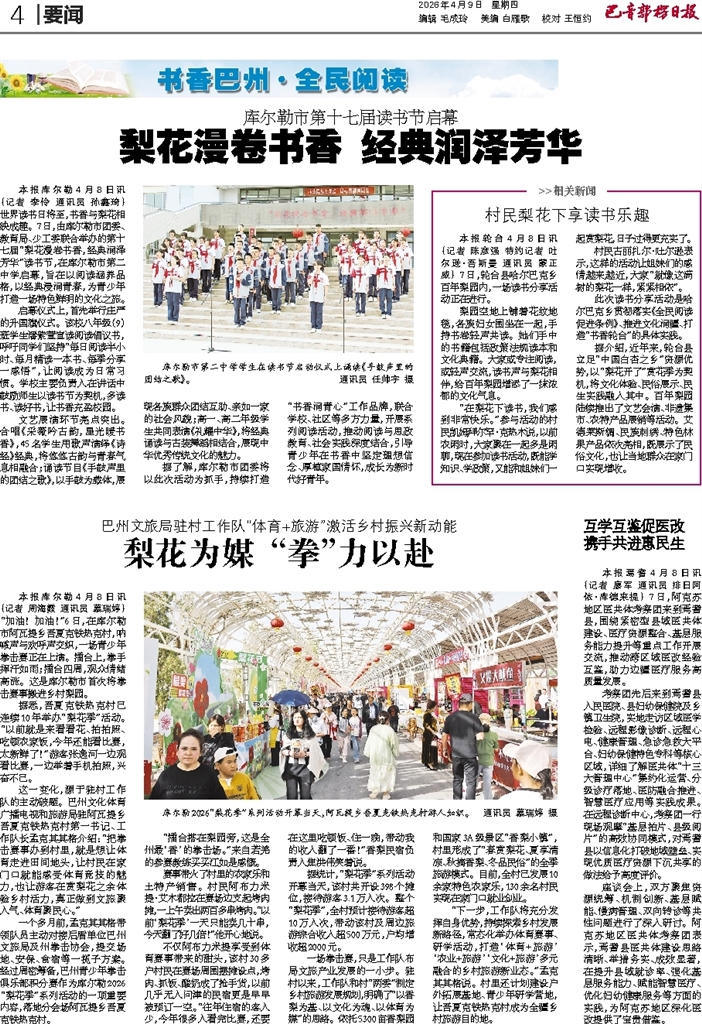 - 梨花漫卷书香 经典润泽芳华 本报库尔勒4月8日讯 (记者 李伶 通讯员 孙鑫琦) 世界读书日将至,书香与梨花相映成趣。7日,由库尔勒市团委、教育局、少工委联合举办的第十七届“梨花漫卷书香,经典润泽芳华”读书节,在库尔勒市第二