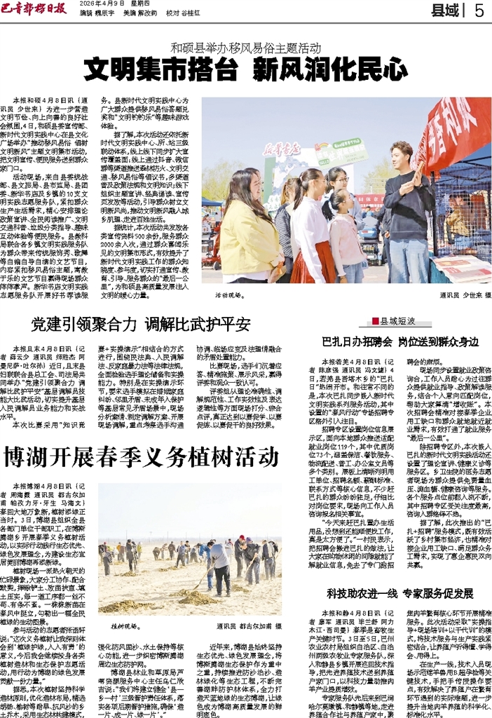 - 巴扎日办招聘会 岗位送到群众身边 本报若羌4月8日讯 (记者 陈彦强 通讯员 冯文婕) 4日,若羌县吾塔木乡的“巴扎日”热闹开市。和往常不同的是,本次巴扎同步嵌入新时代文明实践系列服务活动,其中设置的“春风行动”专场招聘专区格外引