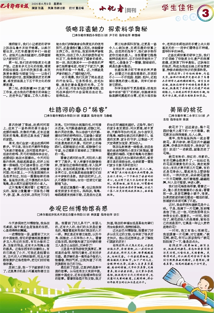 - 美丽的桃花 □库尔勒市第二小学三(8)班 卢志恺 指导老师 陈琪 桃花开了!远远望去,整个花园好像天上落下的一大片朝霞。桃花散发出阵阵清香,沁人心脾。 清早,我和爸爸妈妈一起去看桃花。春风徐徐,桃花在